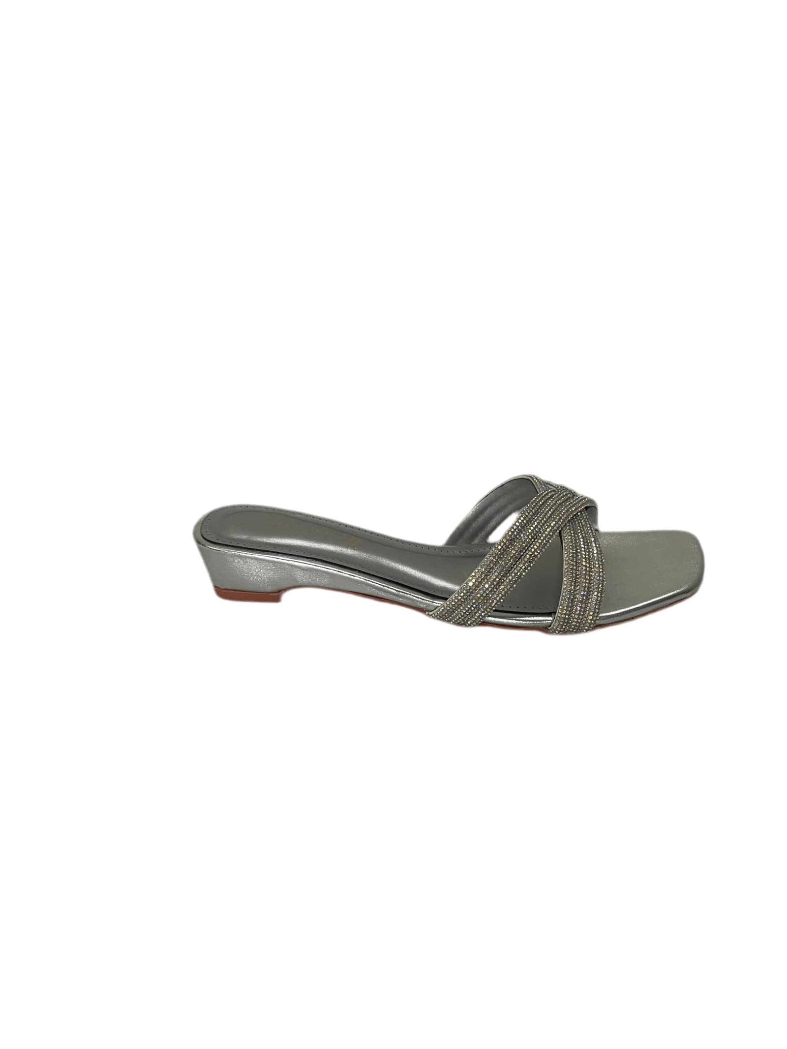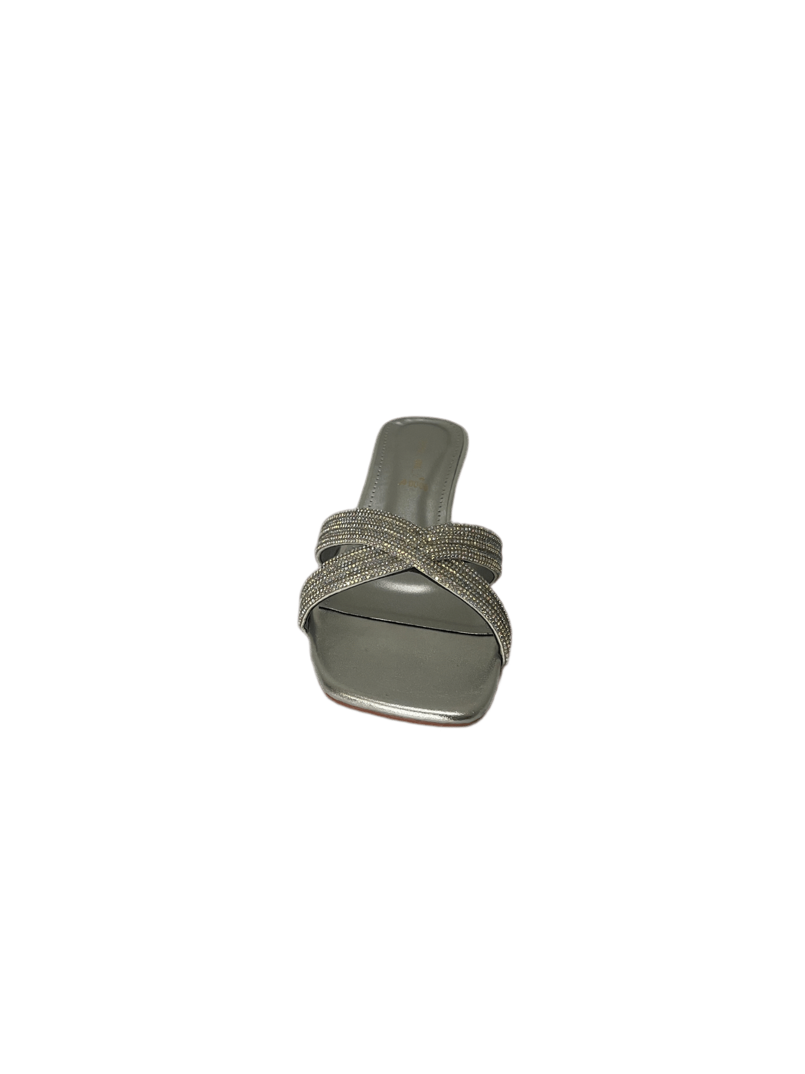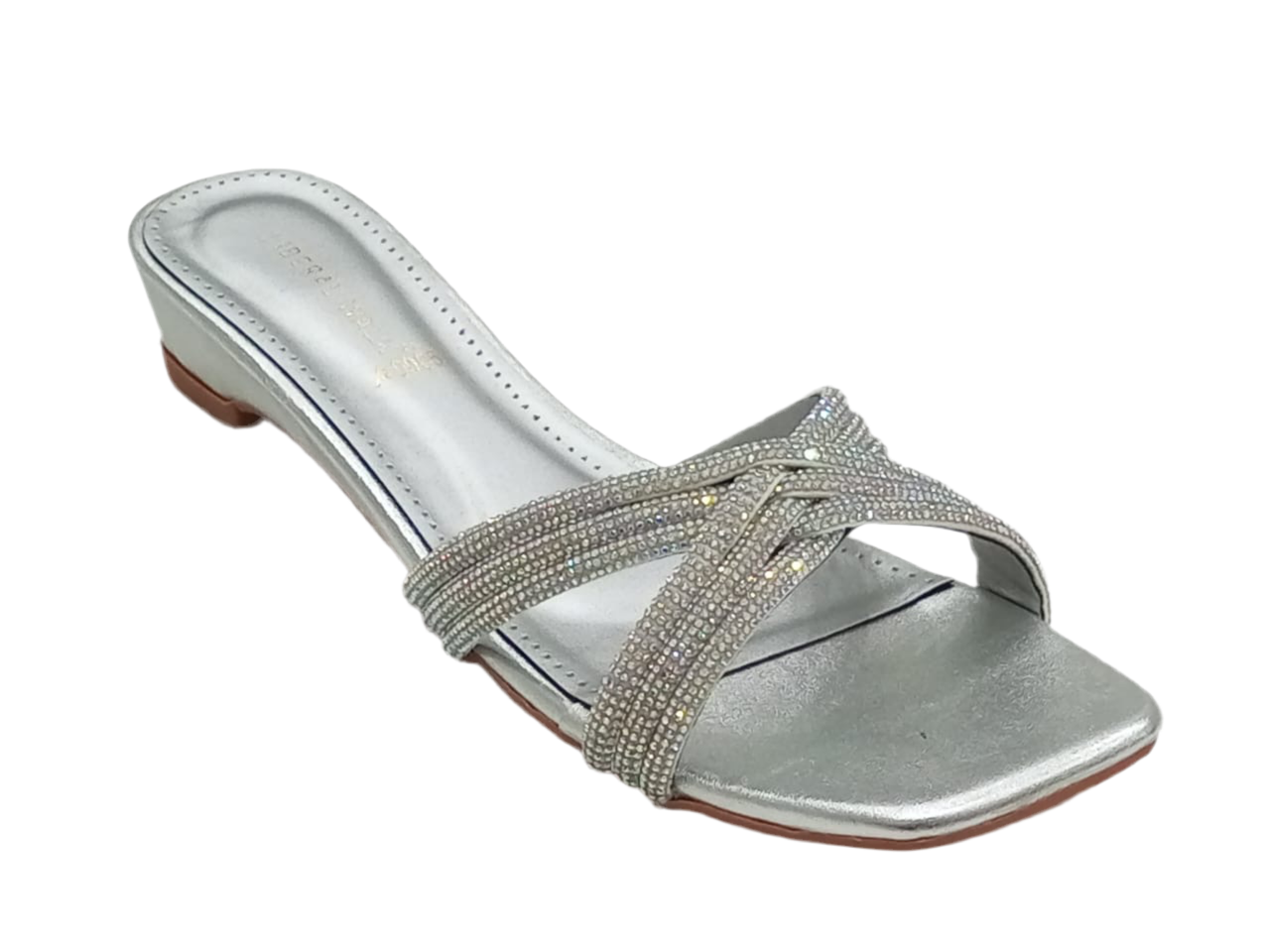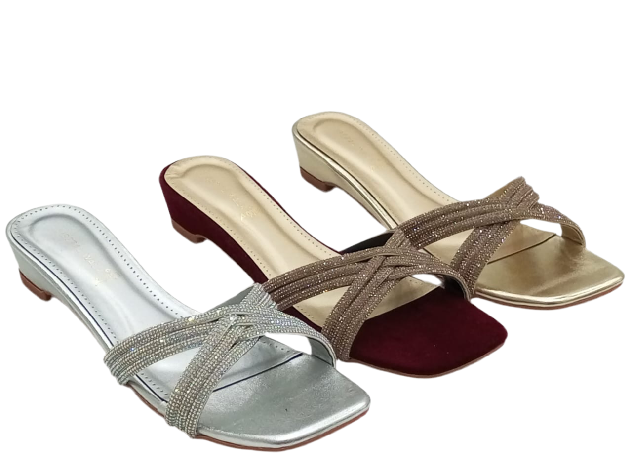 Ladies flat slippers in pakistan with a sleek metallic finish and modern square toe design.