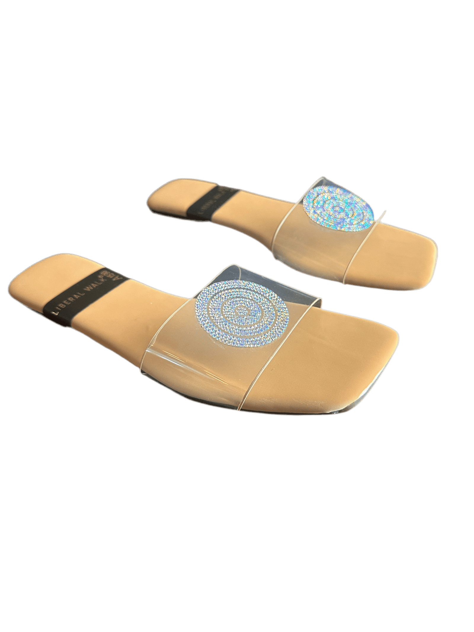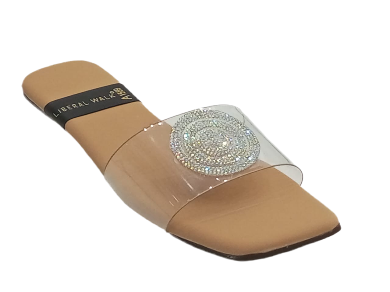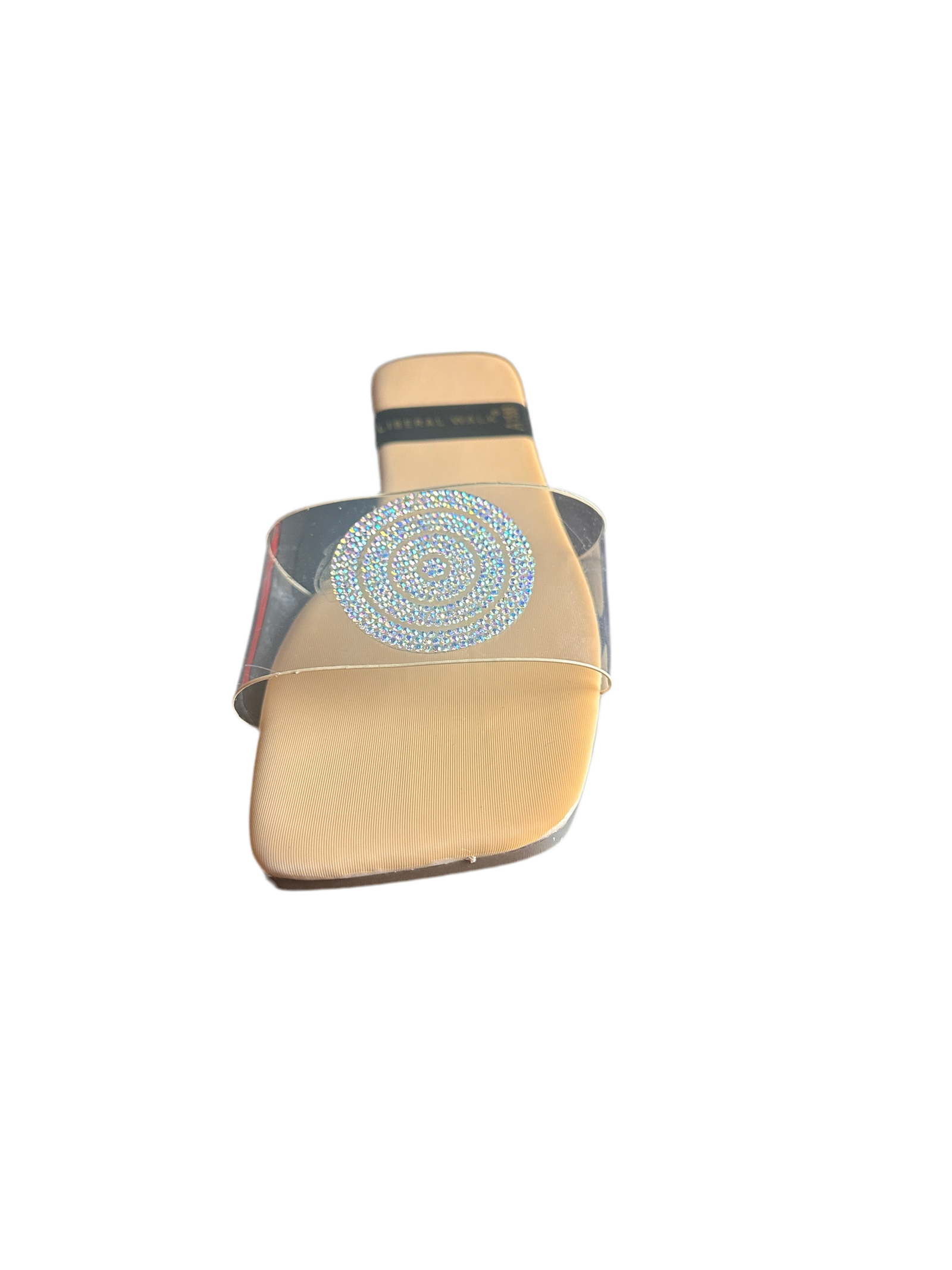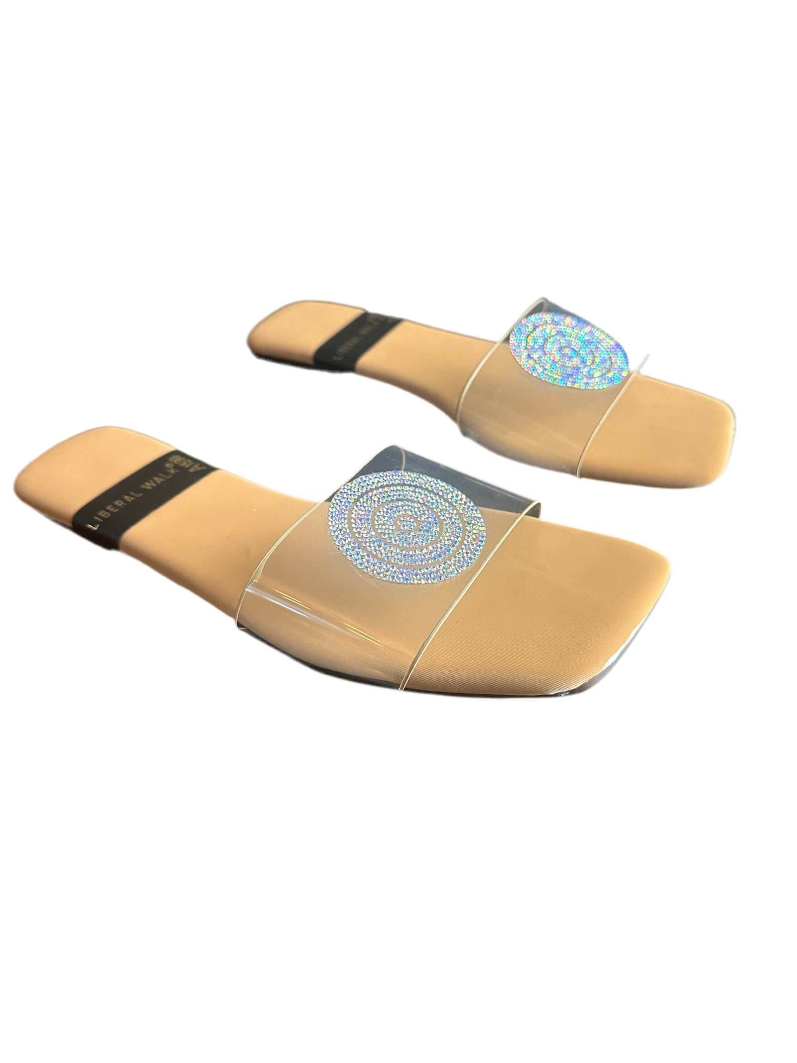 - Elegant transparent slippers in Pakistan with a rhinestone circular motif.