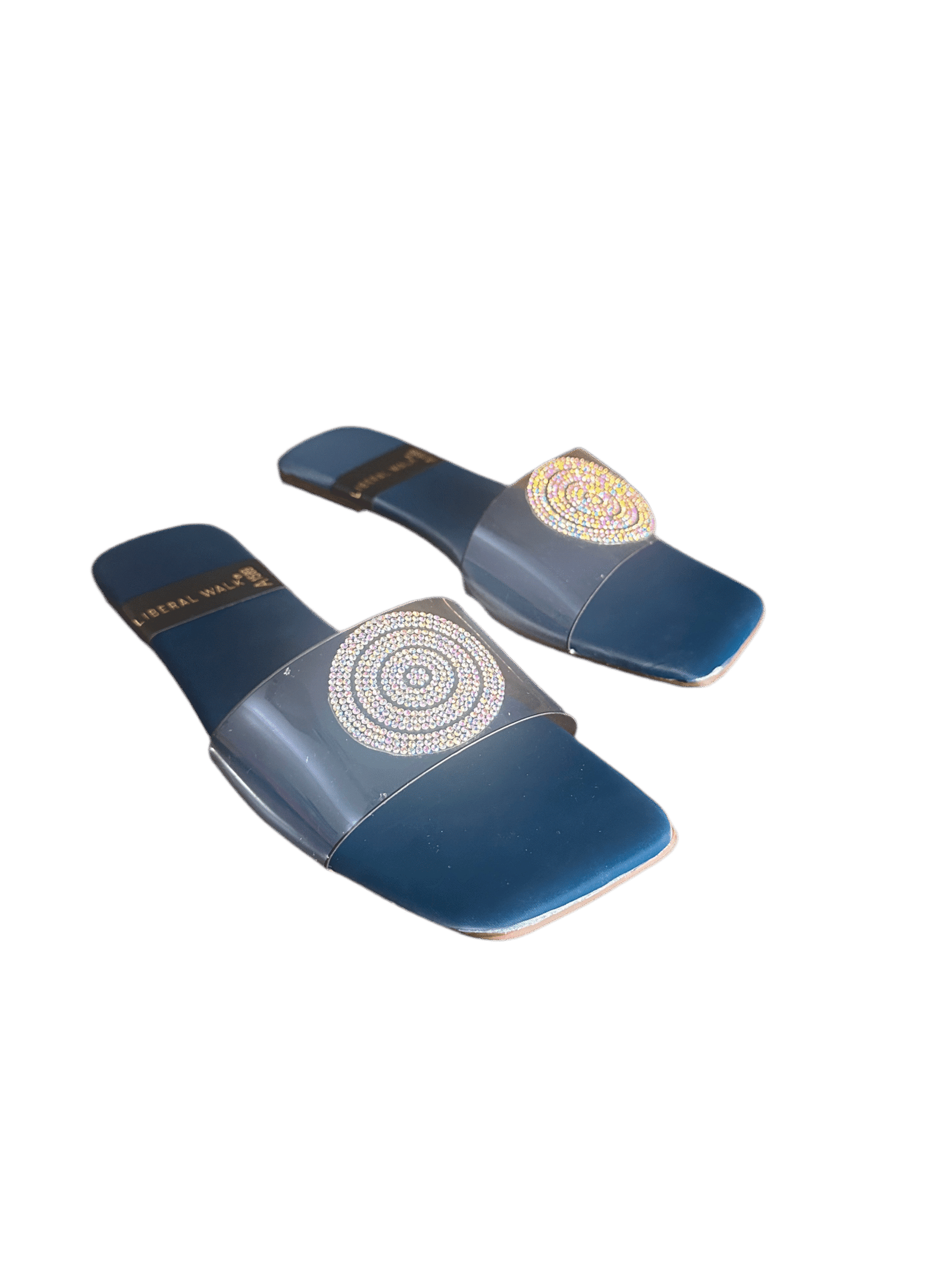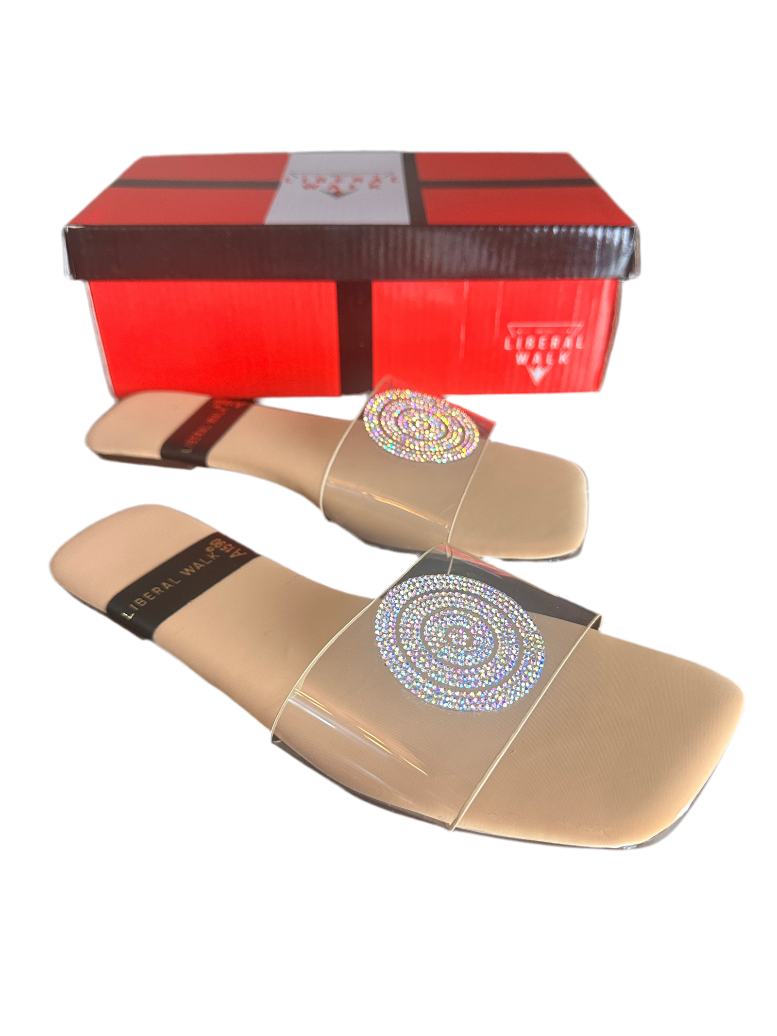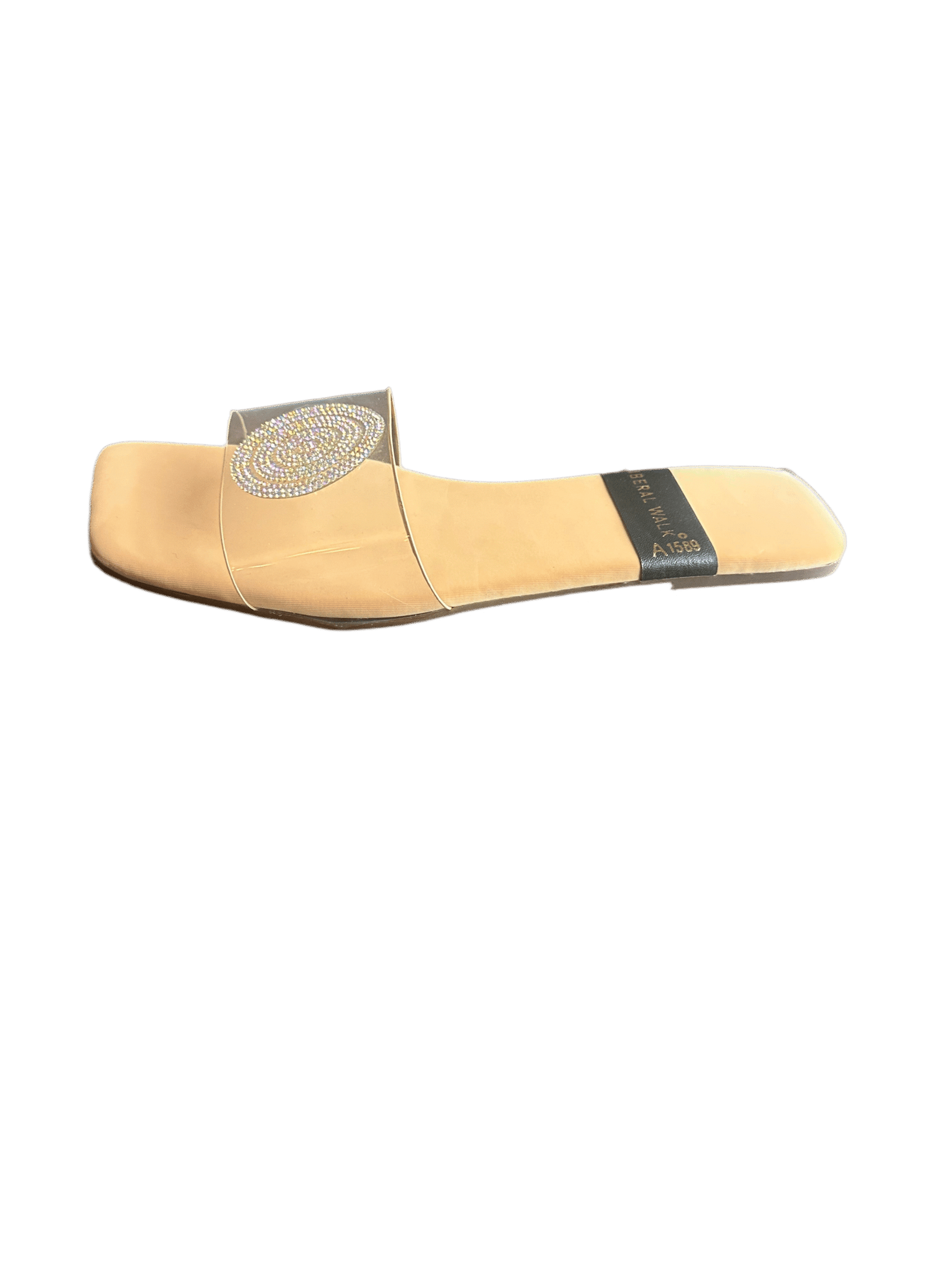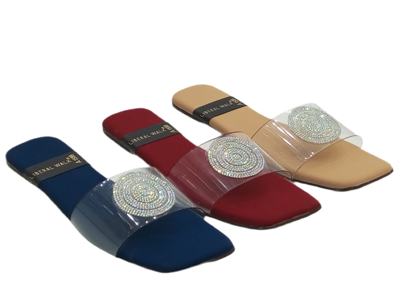 - Elegant transparent slippers in Pakistan with a rhinestone circular motif.